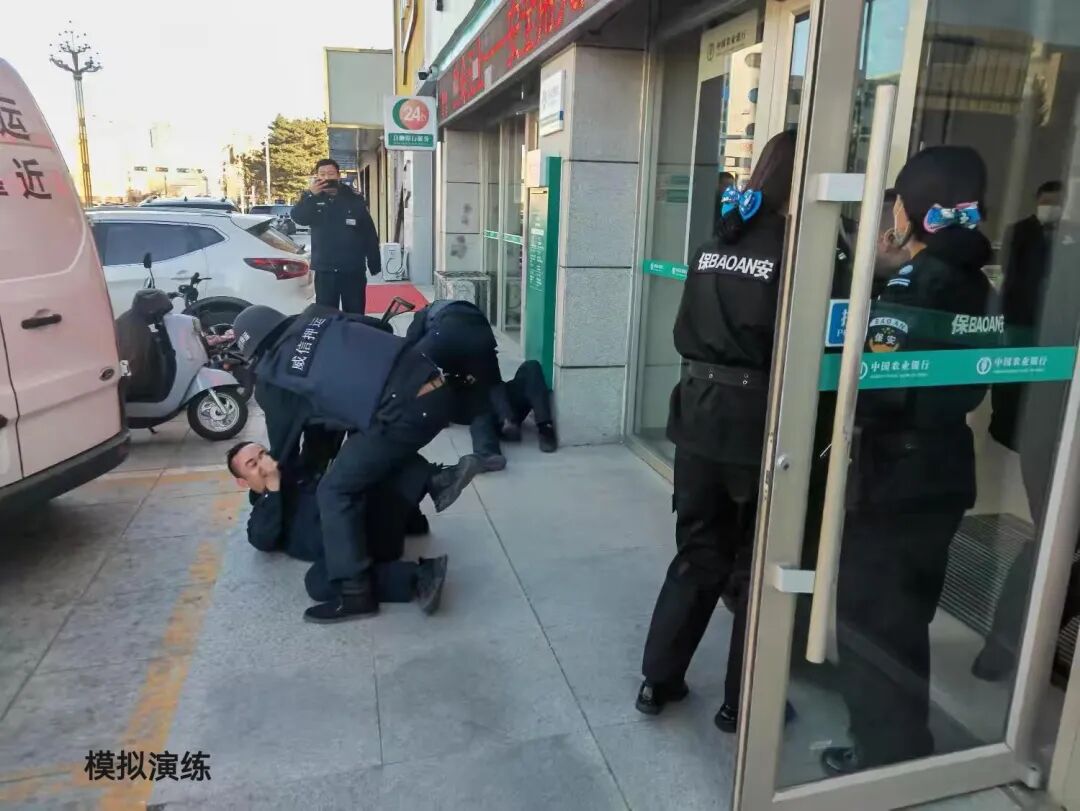 演练现场氛围紧张而有序,各环节衔接紧凑高效。当押运车组严格按照规范流程抵达网点,解款员与银行柜员正有条不紊地开展款箱交接工作时,“歹徒”突然发难,现场“险情”骤生。面对突发状况,赤峰威信押运公司押运队员沉着冷静、反应迅速,瞬间进入战斗状态:驾驶员第一时间锁闭车辆,同步开启警报系统持续示警;警戒队员果断持械上前,快速构建外围警戒防线,有效遏制“歹徒”进一步行动;解款员在队友的严密掩护下,动作迅捷规范,迅速将款箱转移至安全区域。与此同时,农行网点内警报即时响起,工作人员立即启动应急预案,快速引导客户疏散、封闭关键通道,与押运队伍形成高效联动,共同对“歹徒”形成合围遏制态势。整个处置过程环环相扣、指令清晰、动作标准、配合默契,成功化解险情,确保了款箱绝对安全。