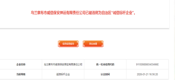 近日,在自治区企业诚信建设评选中,乌兰察布市威信押运公司凭借卓越的诚信经营记录和规范的企业管理体系,荣获自治区“诚信标杆企业”称号。这一荣誉不仅是对公司长期坚守诚信经营理念的肯定,更是对其在行业中发挥示范引领作用的认可。