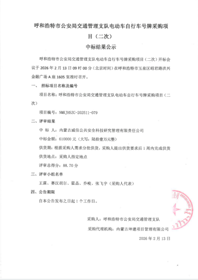 接下来,科技公司将严格按照项目要求,精心组织、科学统筹,确保按时、保质、高效完成号牌的生产与交付工作,全力配合呼和浩特市公安局交通管理支队推进电动自行车规范化管理,助力提升首府城市交通治理现代化水平,为营造安全、有序、畅通的道路交通环境贡献企业力量。